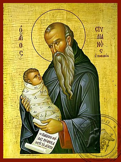 Ο Αγιος Στυλιανός με τη αγάπη για μωρά, για μικρά παιδιά. Τι ωραία ειναι η εικόνα μας του Αγ. Στυλιανού. O Στυλιανος ζουσε αυστηρή ζωη σε σπηλαια, με πολλά θάυματα και για στειρες γυναικες.